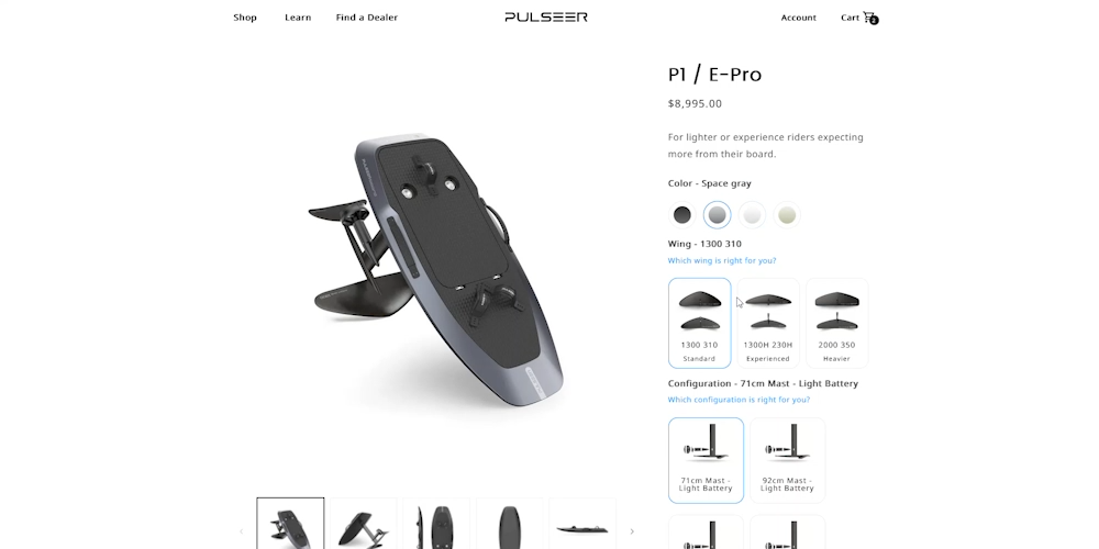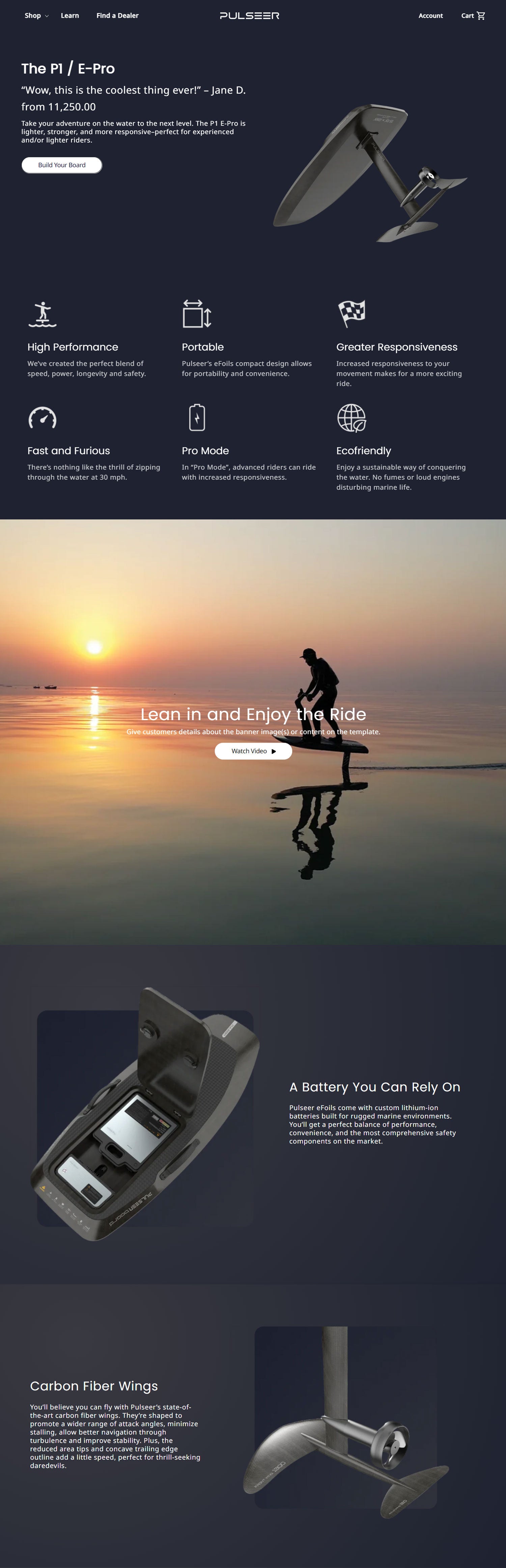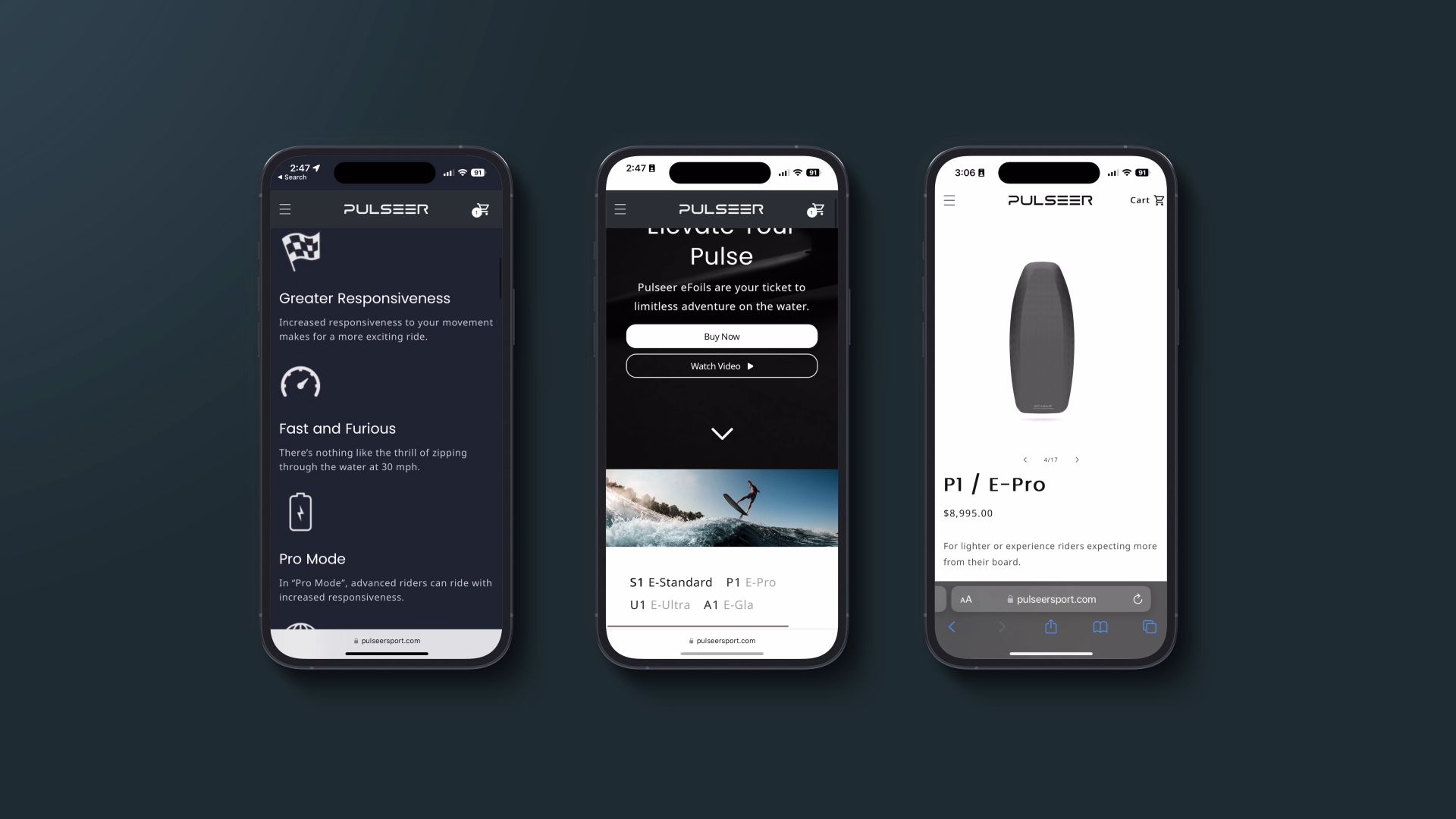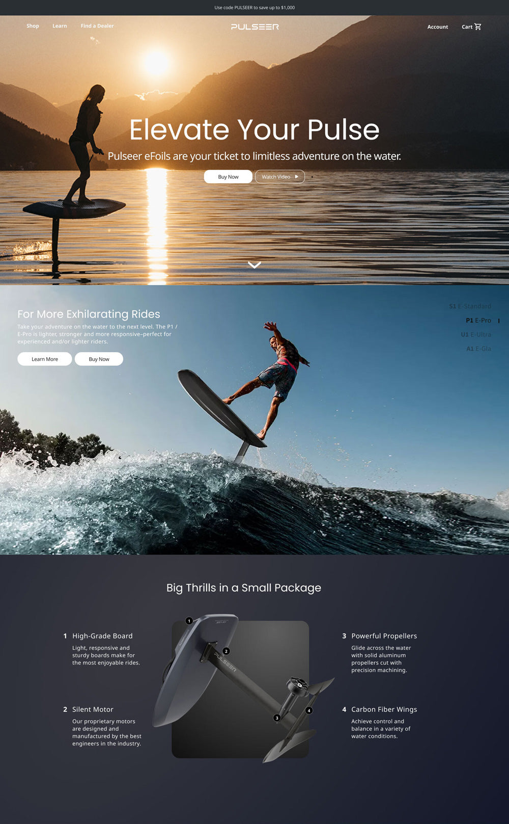 Designing and developing a new ecommerce site for Pulseer presented several unique challenges that our team was able to overcome. The first challenge was to find a way to effectively demonstrate the excitement of fast-paced hydrofoil surfing on a two-dimensional website. Pulseer's customers are thrill seekers who need an immersive experience. Other aspects we needed to convey included:
