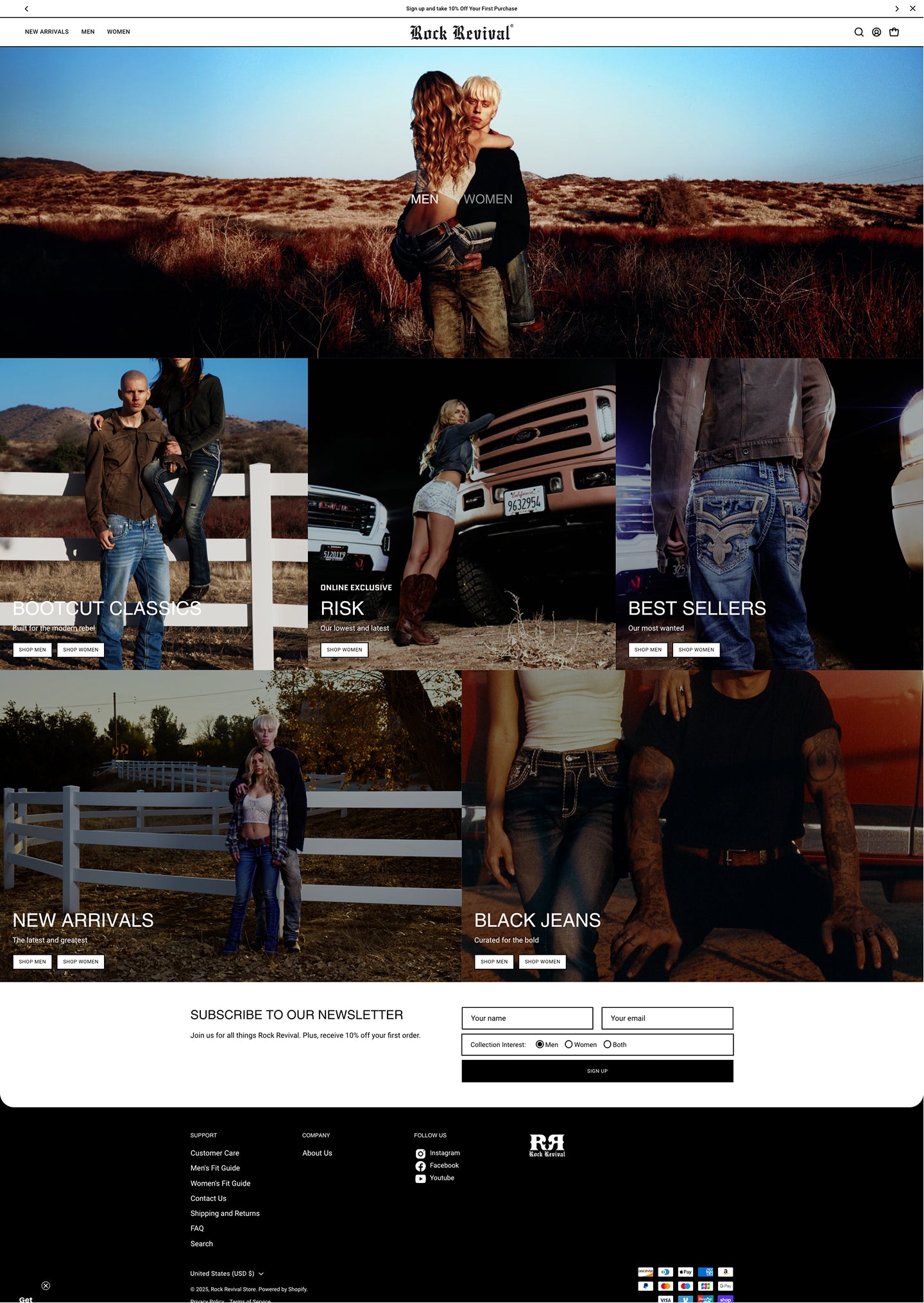 The move to Shopify Plus provided Rock Revival with a modern, scalable ecommerce platform that delivered noticeable improvements in site performance, speed, and user experience. The enhanced design and navigation allowed customers to browse and shop more efficiently, while the advanced filtering options made product discovery seamless. With AI-driven recommendations and wishlist functionality, engagement and conversions saw measurable improvements.