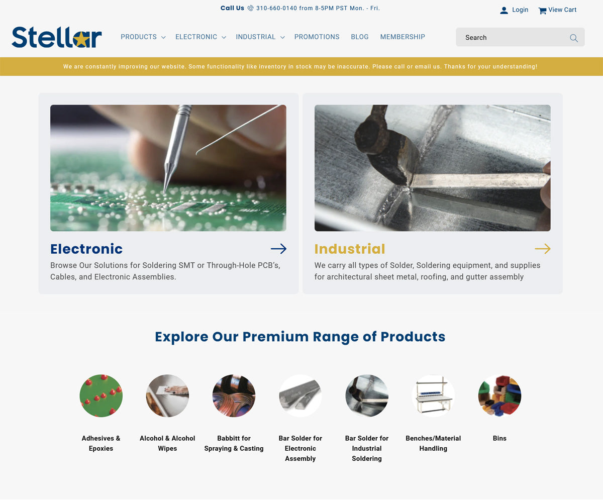 Stellar Technical Products is a leading innovator in the electronics manufacturing industry, specializing in high-quality electronic components and systems. Stellar Technical started with only soldering materials and soldering equipment, but over the years has added everyday production supplies. Stellar Technical provides solutions for consumer electronics to specialized industrial applications. When the time came for Stellar Technical to embark on a site upgrade and brand identity refresh, they trusted our Sunrise Integration team to provide the complete service.