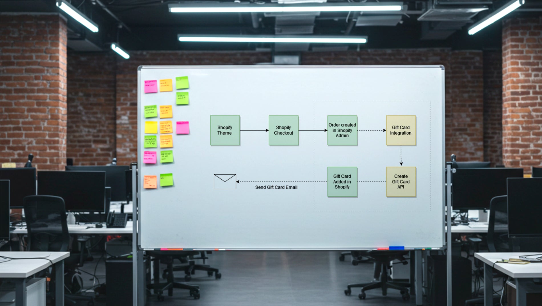 Since a native solution was not possible via the Shopify site, a custom API development was required to meet Untuckit's requirements. The process involved creating a custom Shopify theme page with expanded form fields for the gift cards. This page would capture the gift card details and customer information. The expanded information was saved as special order-properties on the final Shopify order. After the checkout process was completed, a custom created Shopify app (called Gift Card Pro) would intercept the gift card details and create a new workflow using the app.