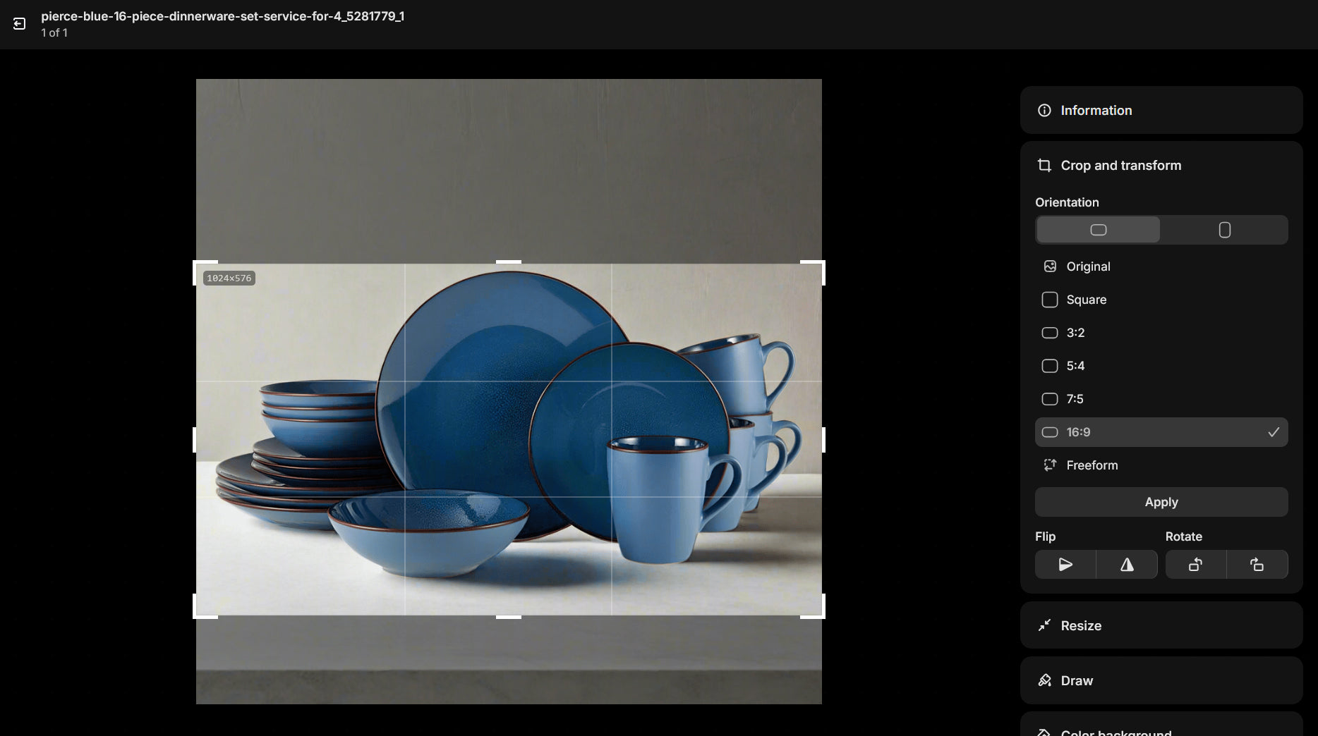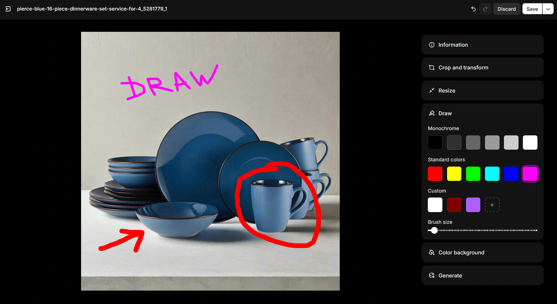 Let’s be honest, this is not going to be as powerful as Photoshop. The native Shopify editor however supports the most critical tasks like cropping, rotating, resizing, annotating and basic transformations. But layered on top of that is some Shopify Magic that brings AI into the mix. You can now incorporate image changes or scene updates to create all new images.